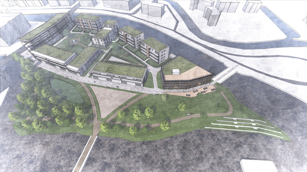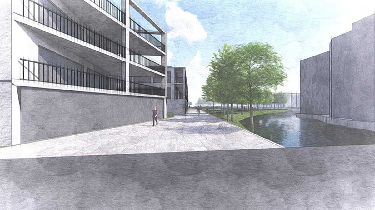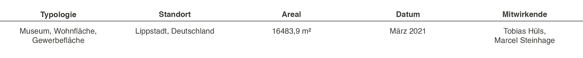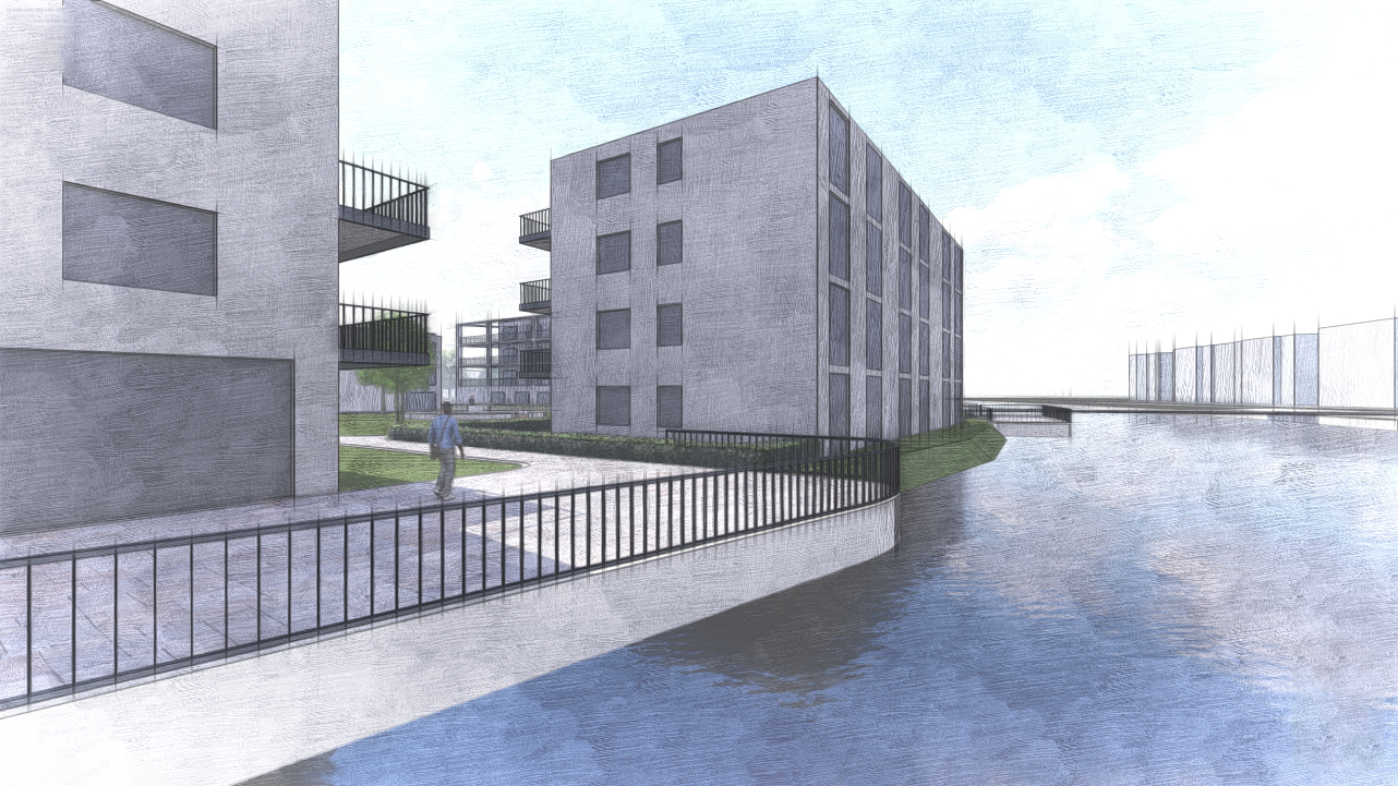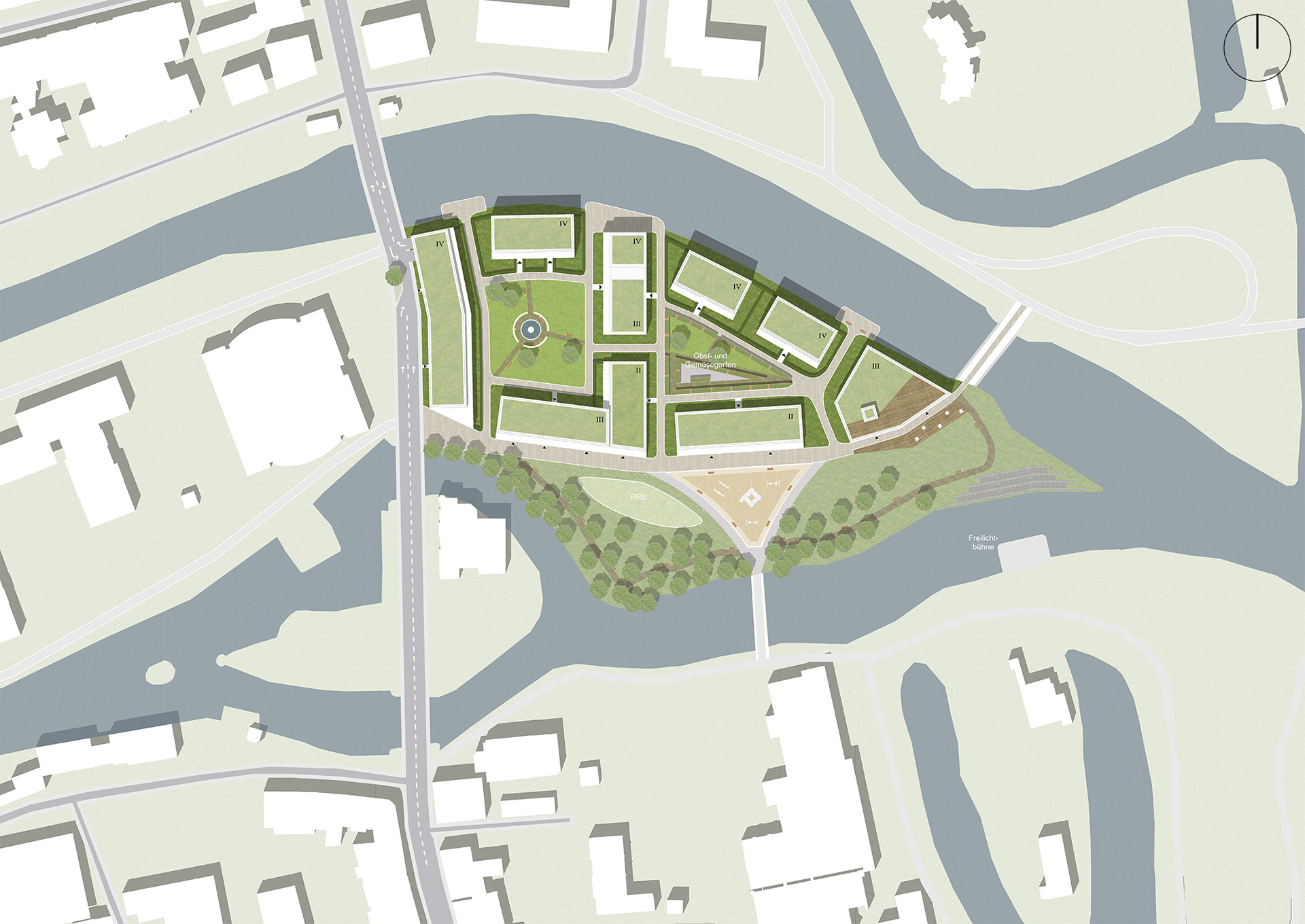 Die Halbinsel befindet sich in Lippstadt. Derzeit ist hier ein Postgelände, welches die Sicht zu den Flüssen versperrt. Das Gebiet wird in dem Entwurf in drei Teile geteilt: einen Bebauungsteil mit einer offenen Randbebauung, die zwei Innenhöfe bilden, und zwei Grünflächen, die durch einen Spielplatz getrennt werden. An der Spitze befindet sich ein Museum, da die Halbinsel sehr prägnant für Lippstadt ist. Die restlichen Gebäude sind hauptsächlich Wohnungen. Im Süden den Weg entlang befindet sich im Erdgeschoss Gewerbe und Wohnnutzung in den oberen Geschossen, im westlichen Gebäude befindet sich eine Büronutzung und Wohnnutzung in den oberen Geschossen und im Norden eine reine Wohnnutzung. Der Gebäudekomplex ist mit einer Tiefgarage versehen.