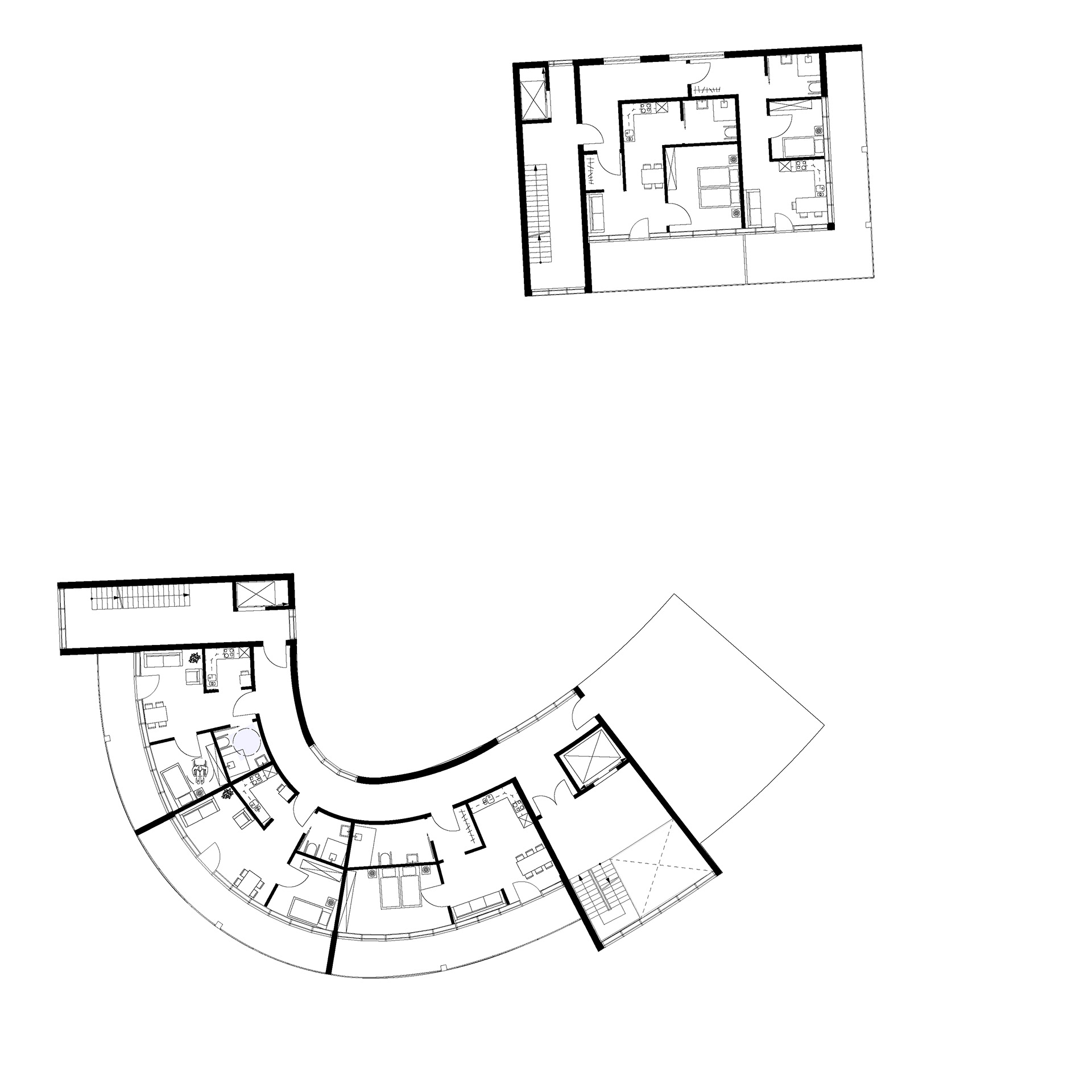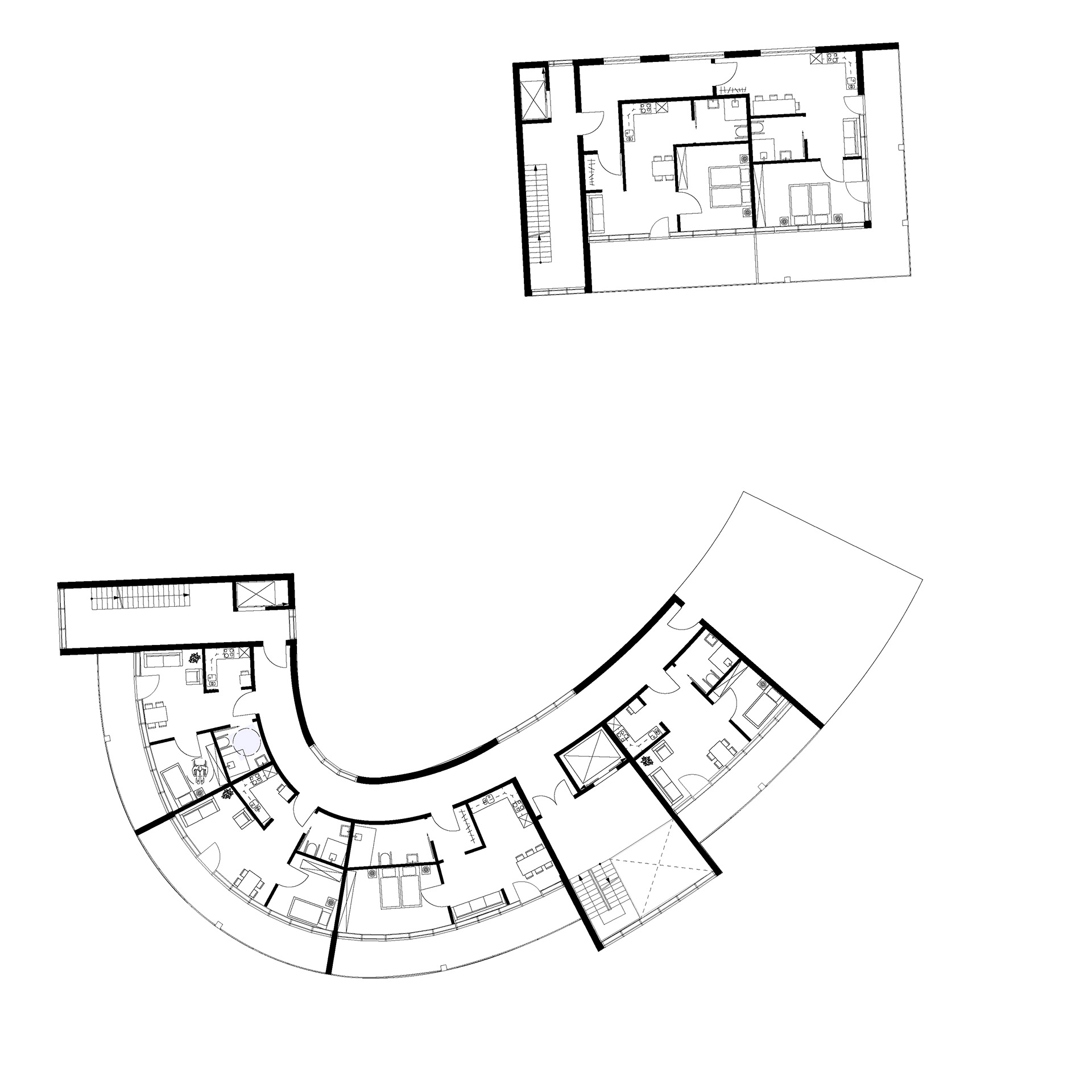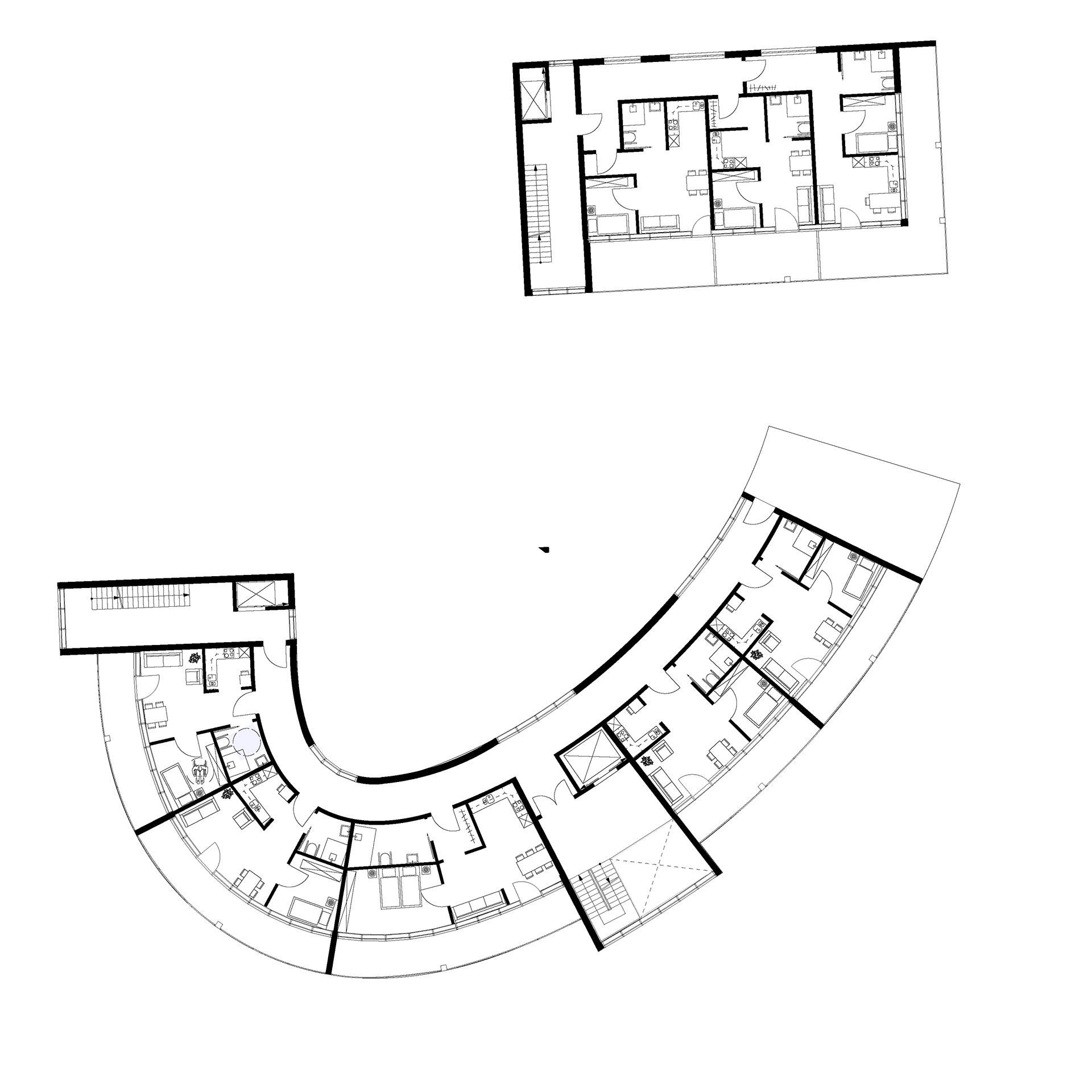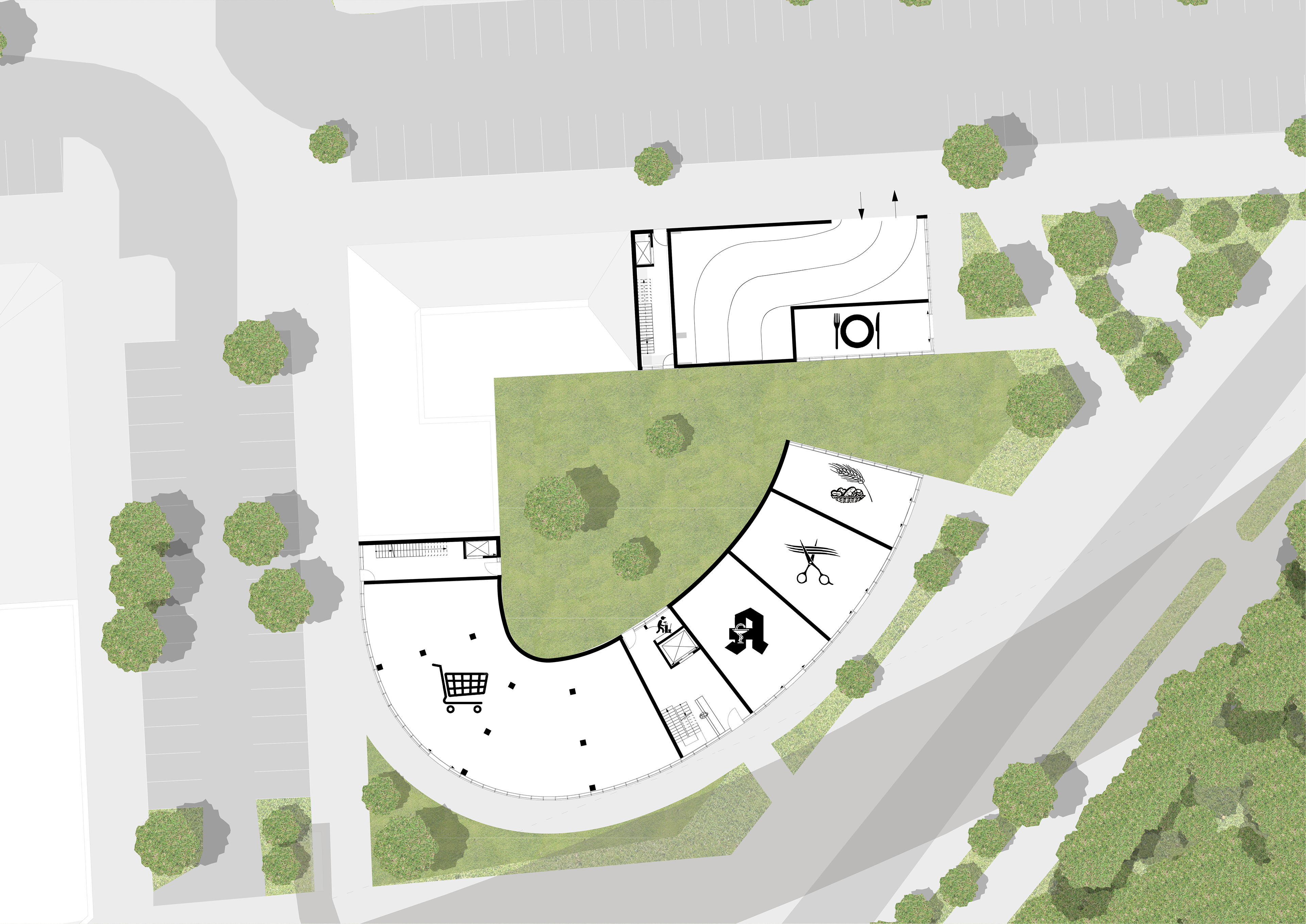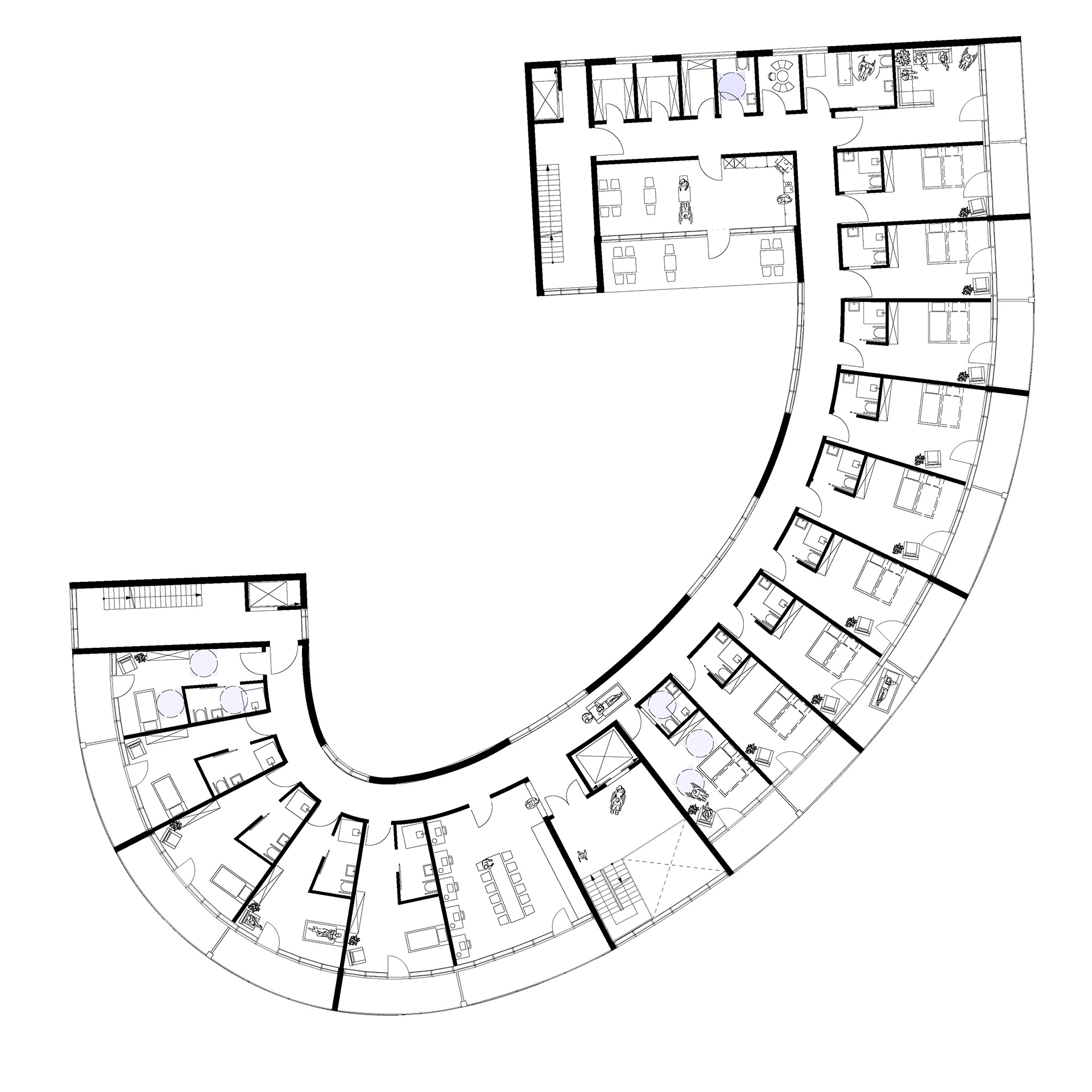Im Erdgeschoss des neuen Gebäudes befinden sich Gewerbeflächen: ein Supermarkt, eine Apotheke, ein Frisör, ein Bäcker und ein Restaurant. Da ältere Menschen mit Behinderungen nicht lange spazieren können, sollten diese Gewerbe in der Nähe sein. Außerdem befindet sich im Erdgeschoss auch eine Einfahrt in die Tiefgarage, diese kann von Bewohnern, deren Besuch und Pflegekräfte benutzt werden. Außerdem befindet sich in der Tiefgarage auch die Technikräume, so wie Lagerfläche für die Bewohner. Das Gebäude verfügt über drei Treppenhäuser, die durch ihre Höhe und ihren Hervorsprung gekennzeichnet sind. Der Rest des Gebäudes baut sich wie eine große Treppe auf. Eine Treppe, die in den Nordosten absteigt und eine die in den Süden runtergeht. Dies sorgt für große Balkone und Dachterrassen, da diese gerade für Hospizgäste benötigt werden, um mit dem Bett in die Natur fahren zu können. Das Erdgeschoss wird in ihrer runden Form durchtrennt, um so einen Eingang in die ‚grüne‘ Hof Mitte zu gelangen. Im ersten Obergeschoss wird diese dann zusammengefügt und sorgt für ein großflächiges Hospiz mit 14 Gästezimmer und allen wichtigen Räumen auf einer Etage. Die Mitarbeiter- und Besuchszimmer liegen dann im Norden des zweiten Obergeschosses. Dieses Geschoss wurde wieder in zwei geteilt, um einen zentralen Punkt der Kommunikation auf einer großen Terrasse mit Rasenfläche zu schaffen. Im Süden des zweiten Geschosses befinden sich die Wohnungen zum betreuten Wohnen. Durch die schmale Kubatur des Gebäudes entsteht immer ein langer Flur in Norden, von diesem sitzen die Wohnungen, beziehungsweise im Hospiz die Gästezimmer, im Süden dran und bekommen alle einen eigenen großflächigen Südbalkon. Die restlichen Geschosse sind so aufgebaut, dass man je Geschosshöhe eine Wohnung weniger hat, aber dafür auf jeder Etage einen Gemeinschaftsbalkon bekommt. Der nördliche abgetrennte Teil der Geschosse wird auch treppenartig nach hinten gesetzt, allerdings entsteht hier nicht ein Gemeinschaftsbalkon, sondern größere private Balkone mit geringer Wahrscheinlichkeit auf Verschattung.