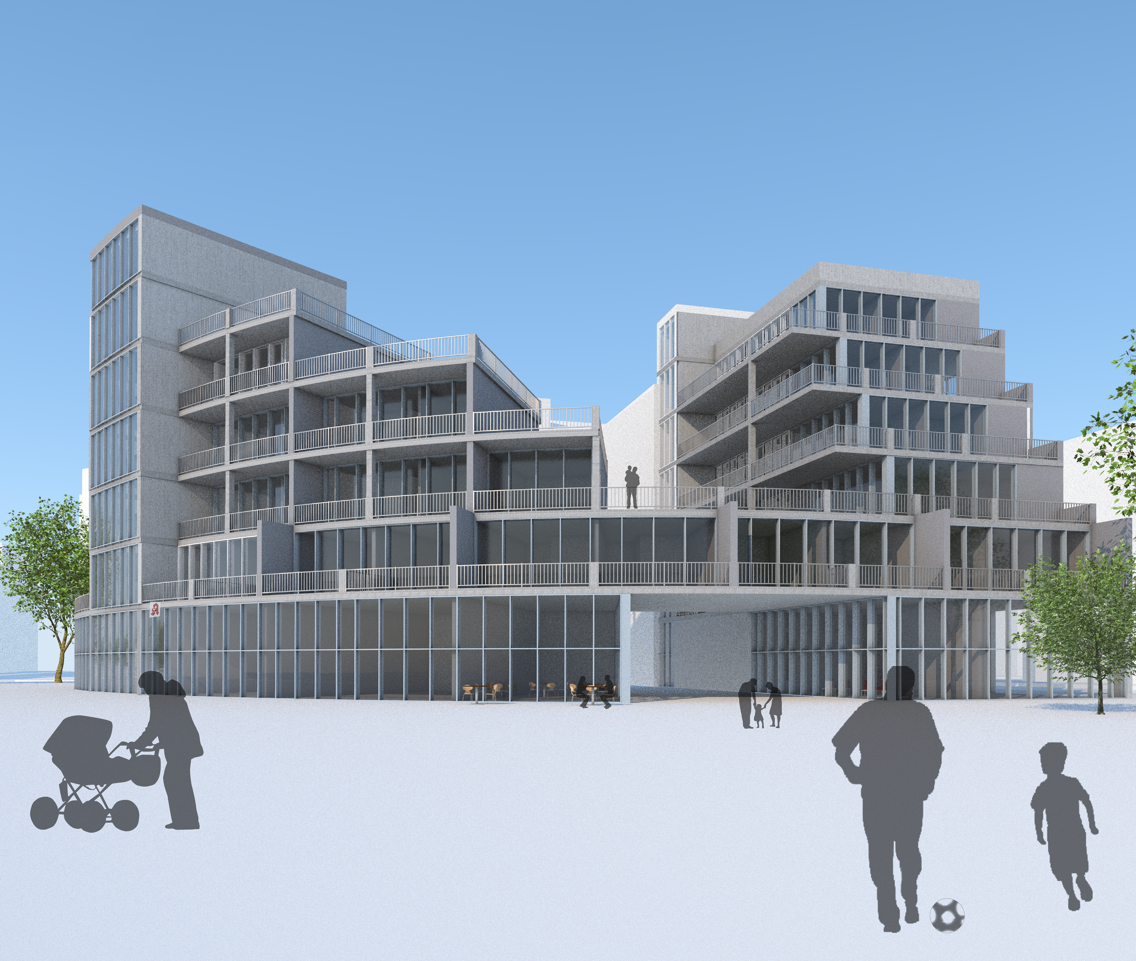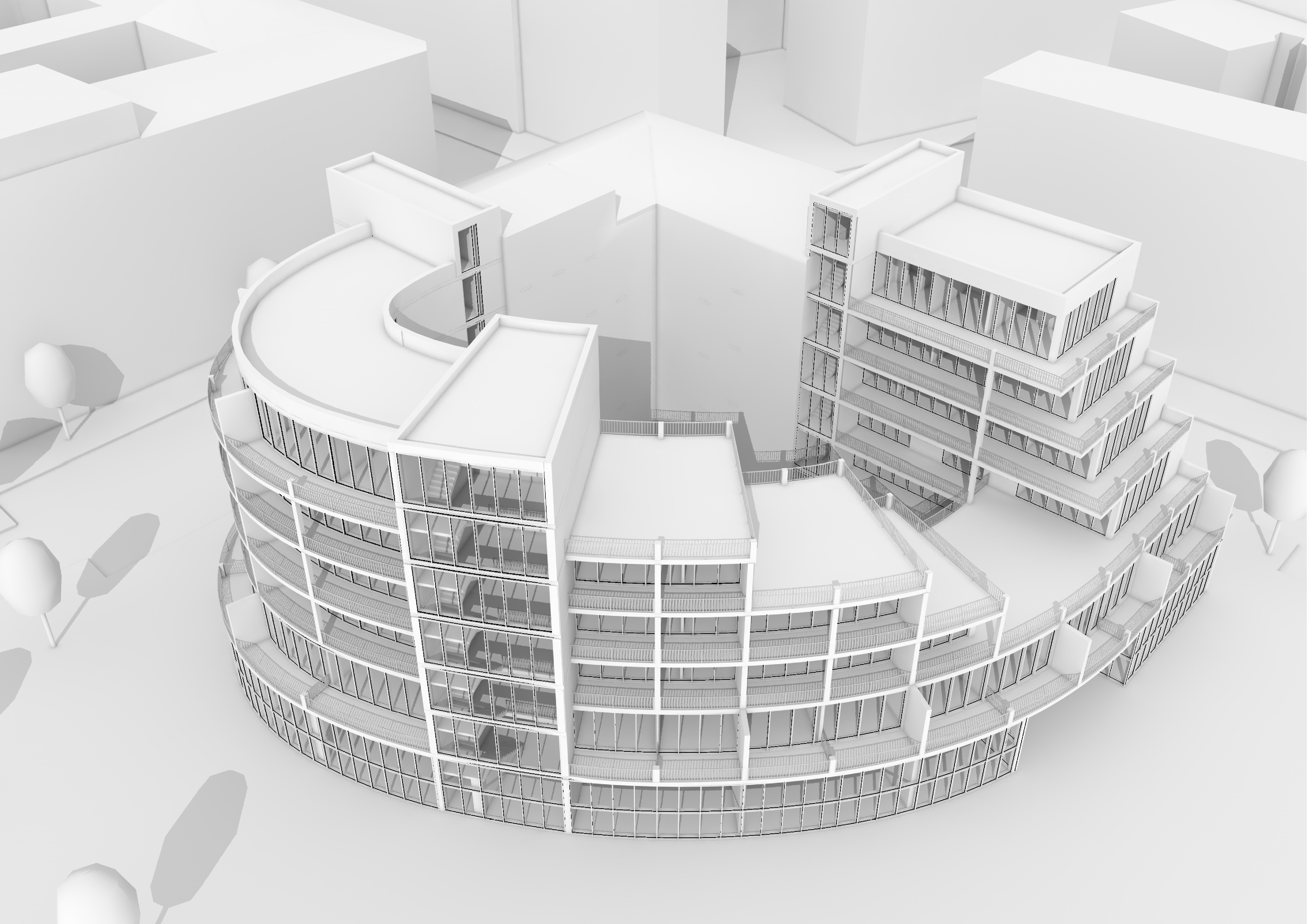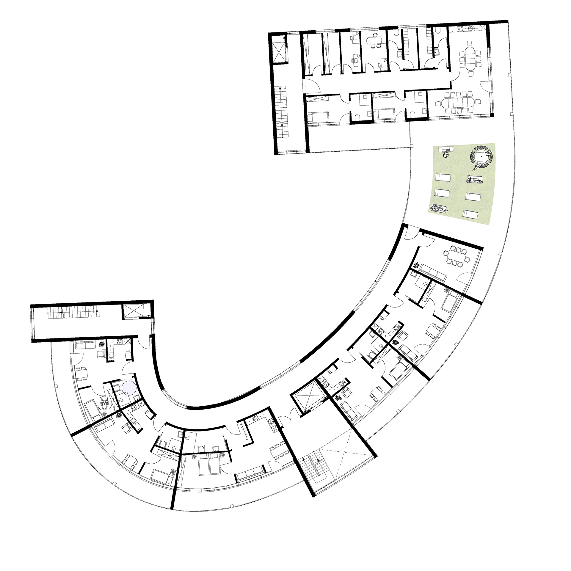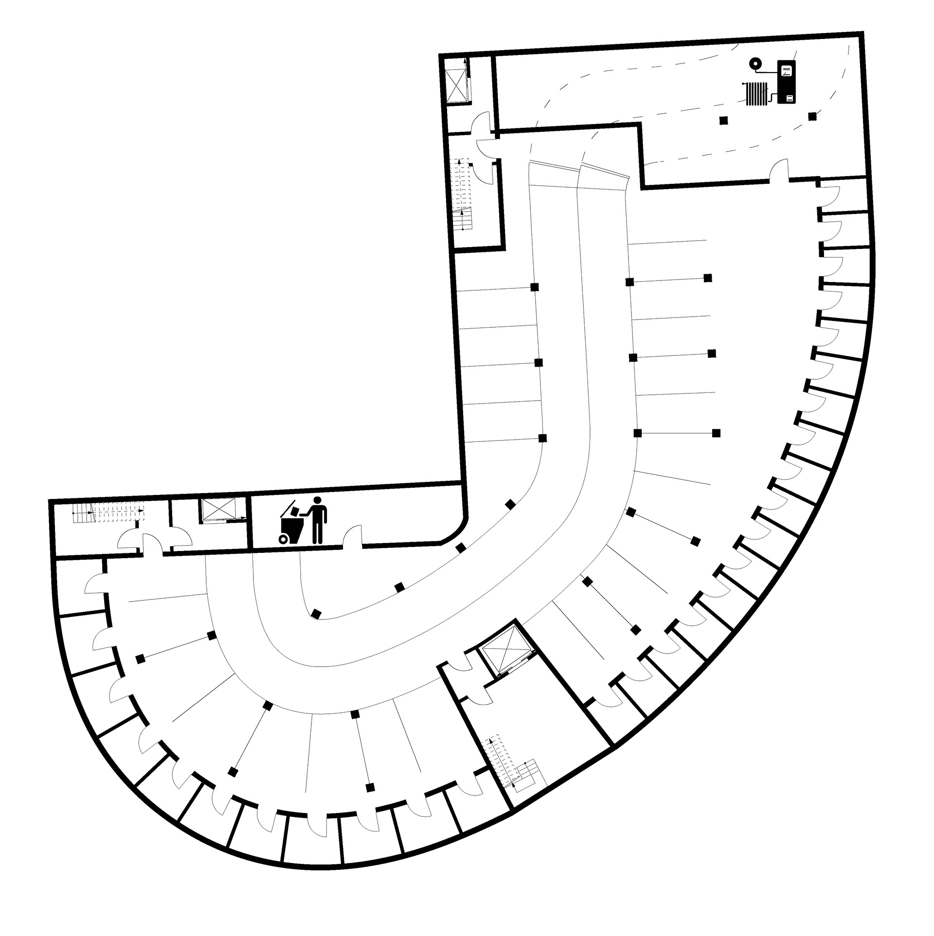 Im Erdgeschoss des neuen Gebäudes befinden sich Gewerbeflächen: ein Supermarkt, eine Apotheke, ein Frisör, ein Bäcker und ein Restaurant. Da ältere Menschen mit Behinderungen nicht lange spazieren können, sollten diese Gewerbe in der Nähe sein. Außerdem befindet sich im Erdgeschoss auch eine Einfahrt in die Tiefgarage, diese kann von Bewohnern, deren Besuch und Pflegekräfte benutzt werden. Außerdem befindet sich in der Tiefgarage auch die Technikräume, so wie Lagerfläche für die Bewohner. Das Gebäude verfügt über drei Treppenhäuser, die durch ihre Höhe und ihren Hervorsprung gekennzeichnet sind. Der Rest des Gebäudes baut sich wie eine große Treppe auf. Eine Treppe, die in den Nordosten absteigt und eine die in den Süden runtergeht. Dies sorgt für große Balkone und Dachterrassen, da diese gerade für Hospizgäste benötigt werden, um mit dem Bett in die Natur fahren zu können. Das Erdgeschoss wird in ihrer runden Form durchtrennt, um so einen Eingang in die ‚grüne‘ Hof Mitte zu gelangen. Im ersten Obergeschoss wird diese dann zusammengefügt und sorgt für ein großflächiges Hospiz mit 14 Gästezimmer und allen wichtigen Räumen auf einer Etage. Die Mitarbeiter- und Besuchszimmer liegen dann im Norden des zweiten Obergeschosses. Dieses Geschoss wurde wieder in zwei geteilt, um einen zentralen Punkt der Kommunikation auf einer großen Terrasse mit Rasenfläche zu schaffen. Im Süden des zweiten Geschosses befinden sich die Wohnungen zum betreuten Wohnen. Durch die schmale Kubatur des Gebäudes entsteht immer ein langer Flur in Norden, von diesem sitzen die Wohnungen, beziehungsweise im Hospiz die Gästezimmer, im Süden dran und bekommen alle einen eigenen großflächigen Südbalkon. Die restlichen Geschosse sind so aufgebaut, dass man je Geschosshöhe eine Wohnung weniger hat, aber dafür auf jeder Etage einen Gemeinschaftsbalkon bekommt. Der nördliche abgetrennte Teil der Geschosse wird auch treppenartig nach hinten gesetzt, allerdings entsteht hier nicht ein Gemeinschaftsbalkon, sondern größere private Balkone mit geringer Wahrscheinlichkeit auf Verschattung.