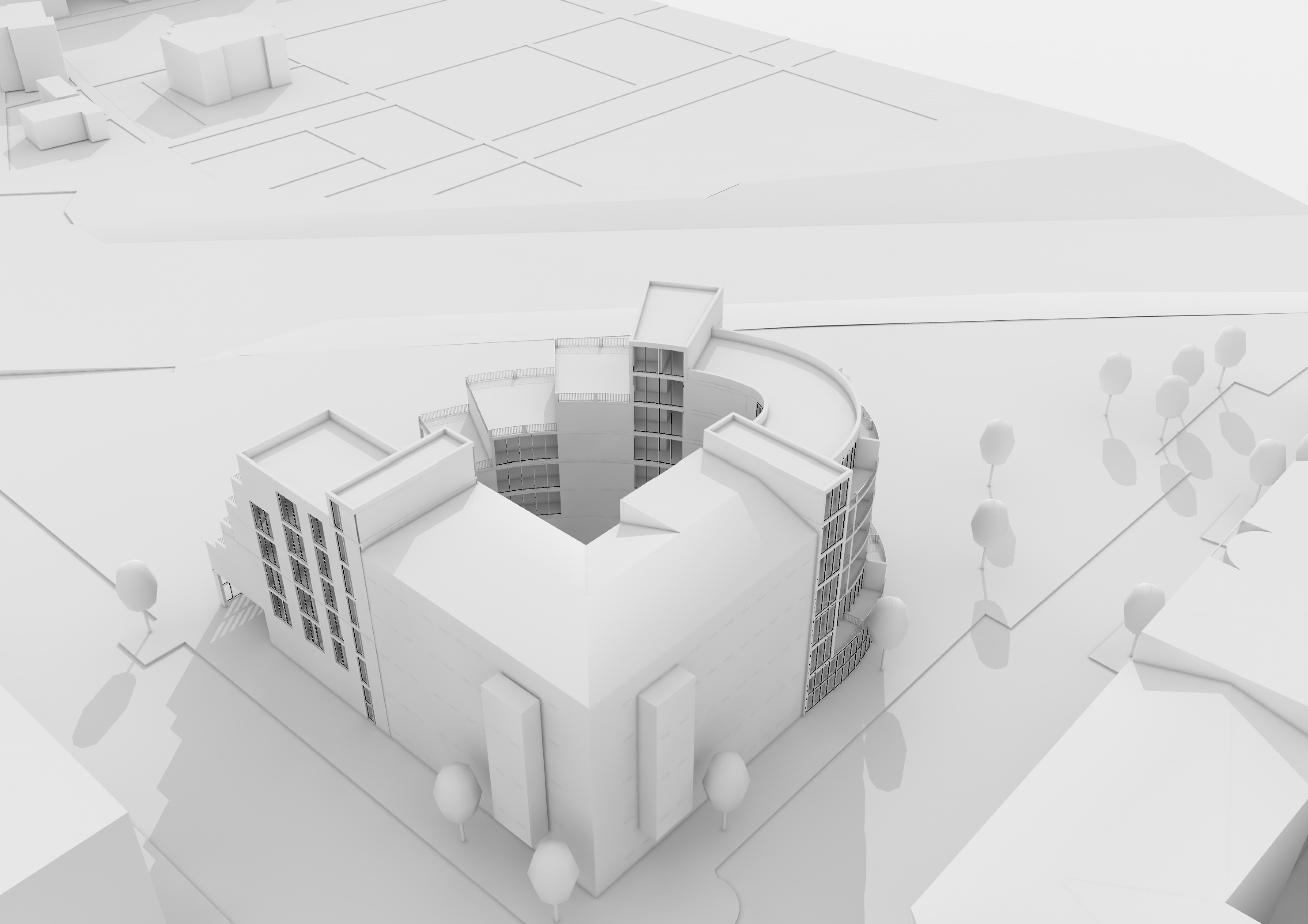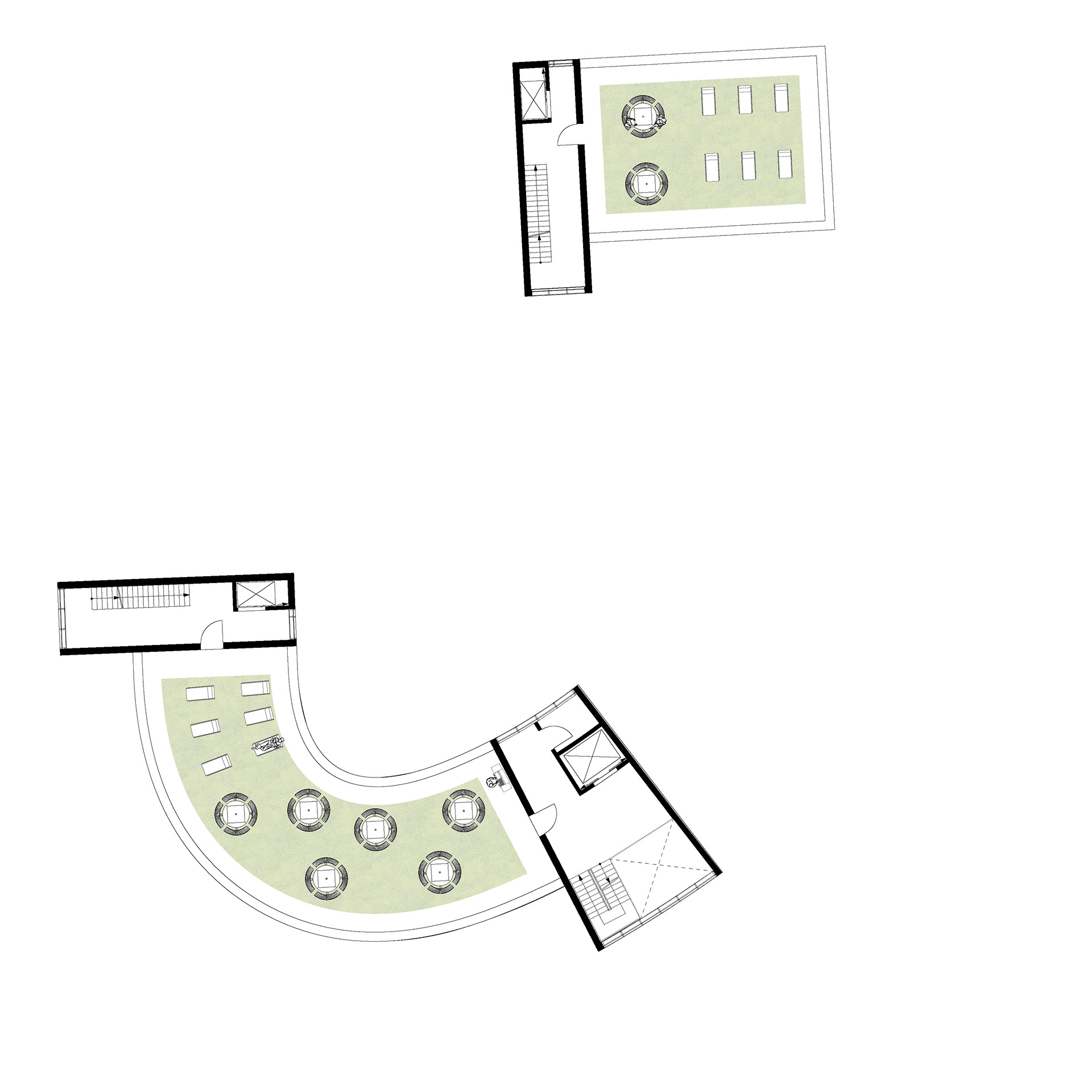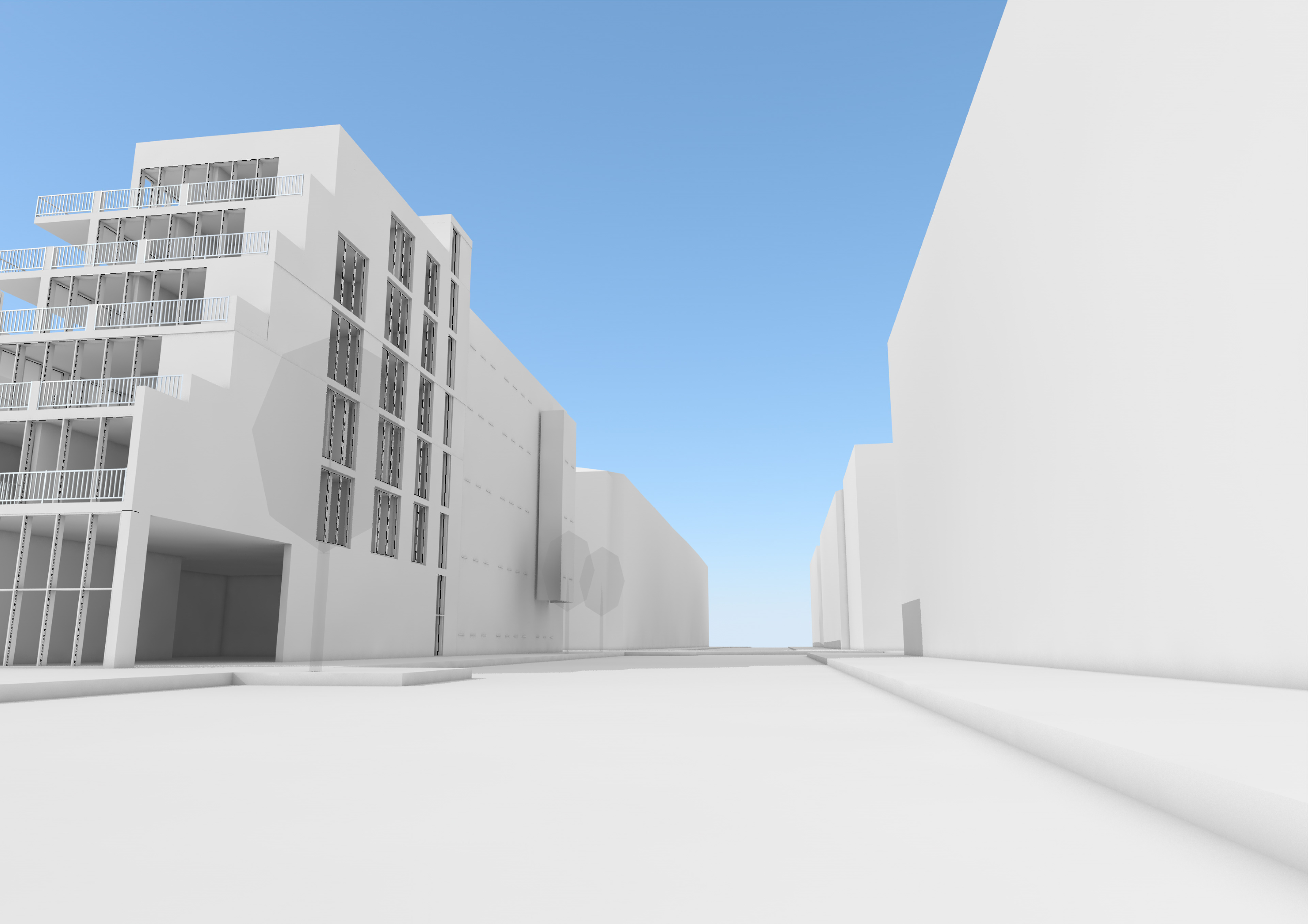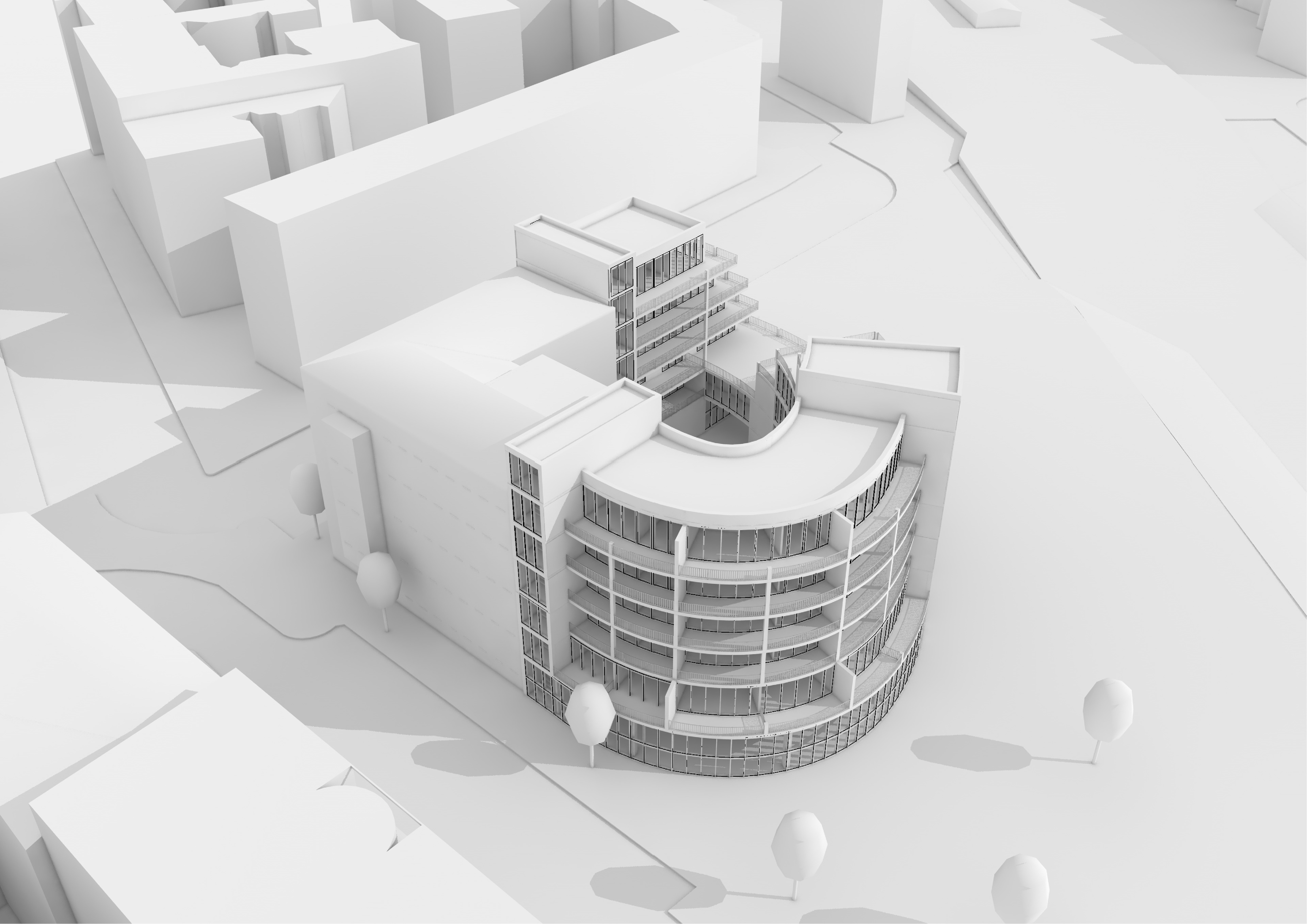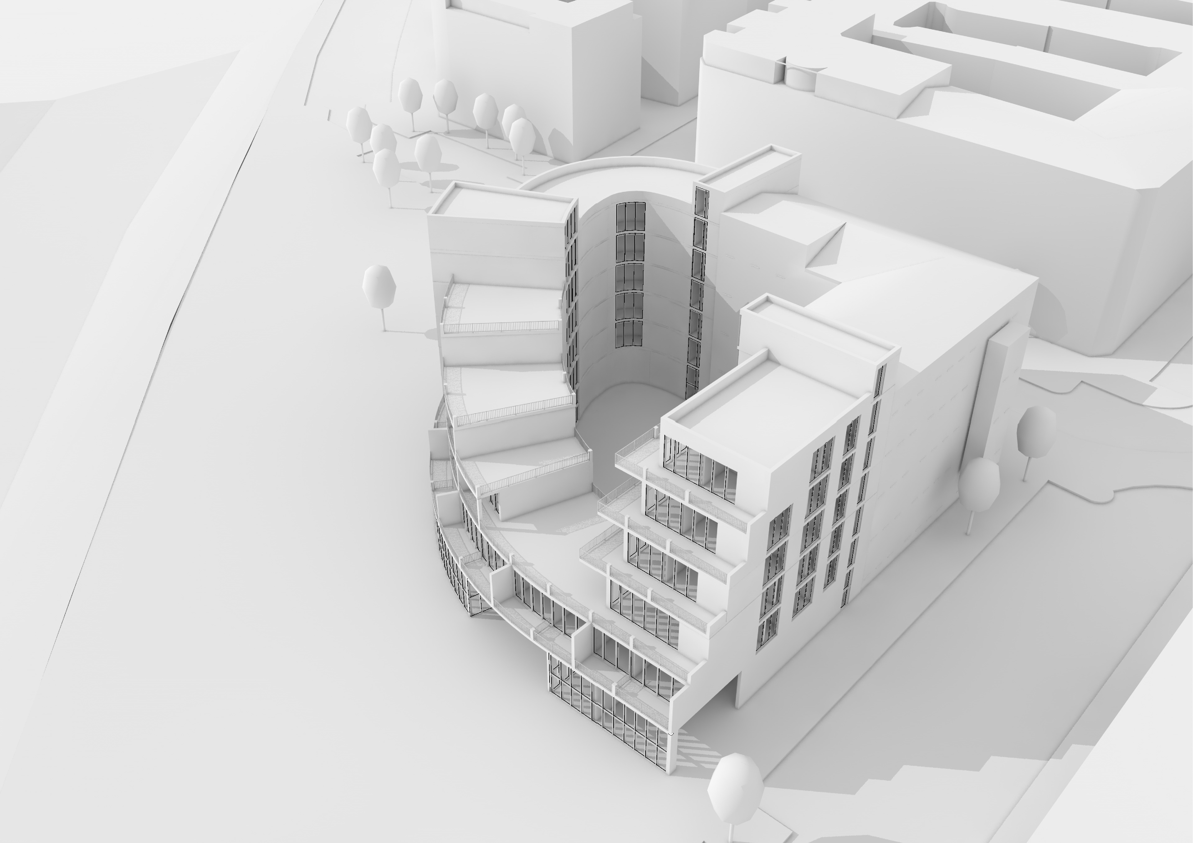 Im Erdgeschoss des neuen Gebäudes befinden sich Gewerbeflächen: ein Supermarkt, eine Apotheke, ein Frisör, ein Bäcker und ein Restaurant. Da ältere Menschen mit Behinderungen nicht lange spazieren können, sollten diese Gewerbe in der Nähe sein. Außerdem befindet sich im Erdgeschoss auch eine Einfahrt in die Tiefgarage, diese kann von Bewohnern, deren Besuch und Pflegekräfte benutzt werden. Außerdem befindet sich in der Tiefgarage auch die Technikräume, so wie Lagerfläche für die Bewohner. Das Gebäude verfügt über drei Treppenhäuser, die durch ihre Höhe und ihren Hervorsprung gekennzeichnet sind. Der Rest des Gebäudes baut sich wie eine große Treppe auf. Eine Treppe, die in den Nordosten absteigt und eine die in den Süden runtergeht. Dies sorgt für große Balkone und Dachterrassen, da diese gerade für Hospizgäste benötigt werden, um mit dem Bett in die Natur fahren zu können. Das Erdgeschoss wird in ihrer runden Form durchtrennt, um so einen Eingang in die ‚grüne‘ Hof Mitte zu gelangen. Im ersten Obergeschoss wird diese dann zusammengefügt und sorgt für ein großflächiges Hospiz mit 14 Gästezimmer und allen wichtigen Räumen auf einer Etage. Die Mitarbeiter- und Besuchszimmer liegen dann im Norden des zweiten Obergeschosses. Dieses Geschoss wurde wieder in zwei geteilt, um einen zentralen Punkt der Kommunikation auf einer großen Terrasse mit Rasenfläche zu schaffen. Im Süden des zweiten Geschosses befinden sich die Wohnungen zum betreuten Wohnen. Durch die schmale Kubatur des Gebäudes entsteht immer ein langer Flur in Norden, von diesem sitzen die Wohnungen, beziehungsweise im Hospiz die Gästezimmer, im Süden dran und bekommen alle einen eigenen großflächigen Südbalkon. Die restlichen Geschosse sind so aufgebaut, dass man je Geschosshöhe eine Wohnung weniger hat, aber dafür auf jeder Etage einen Gemeinschaftsbalkon bekommt. Der nördliche abgetrennte Teil der Geschosse wird auch treppenartig nach hinten gesetzt, allerdings entsteht hier nicht ein Gemeinschaftsbalkon, sondern größere private Balkone mit geringer Wahrscheinlichkeit auf Verschattung.