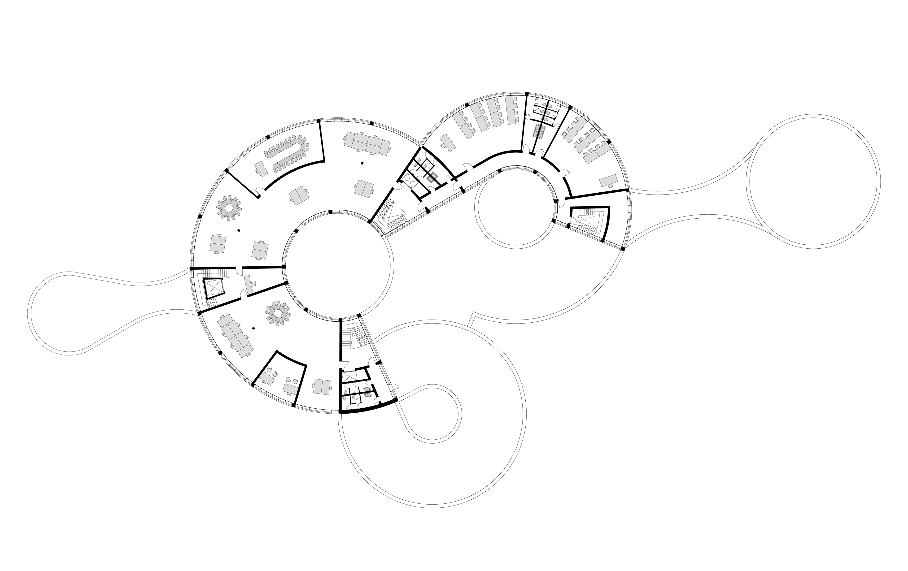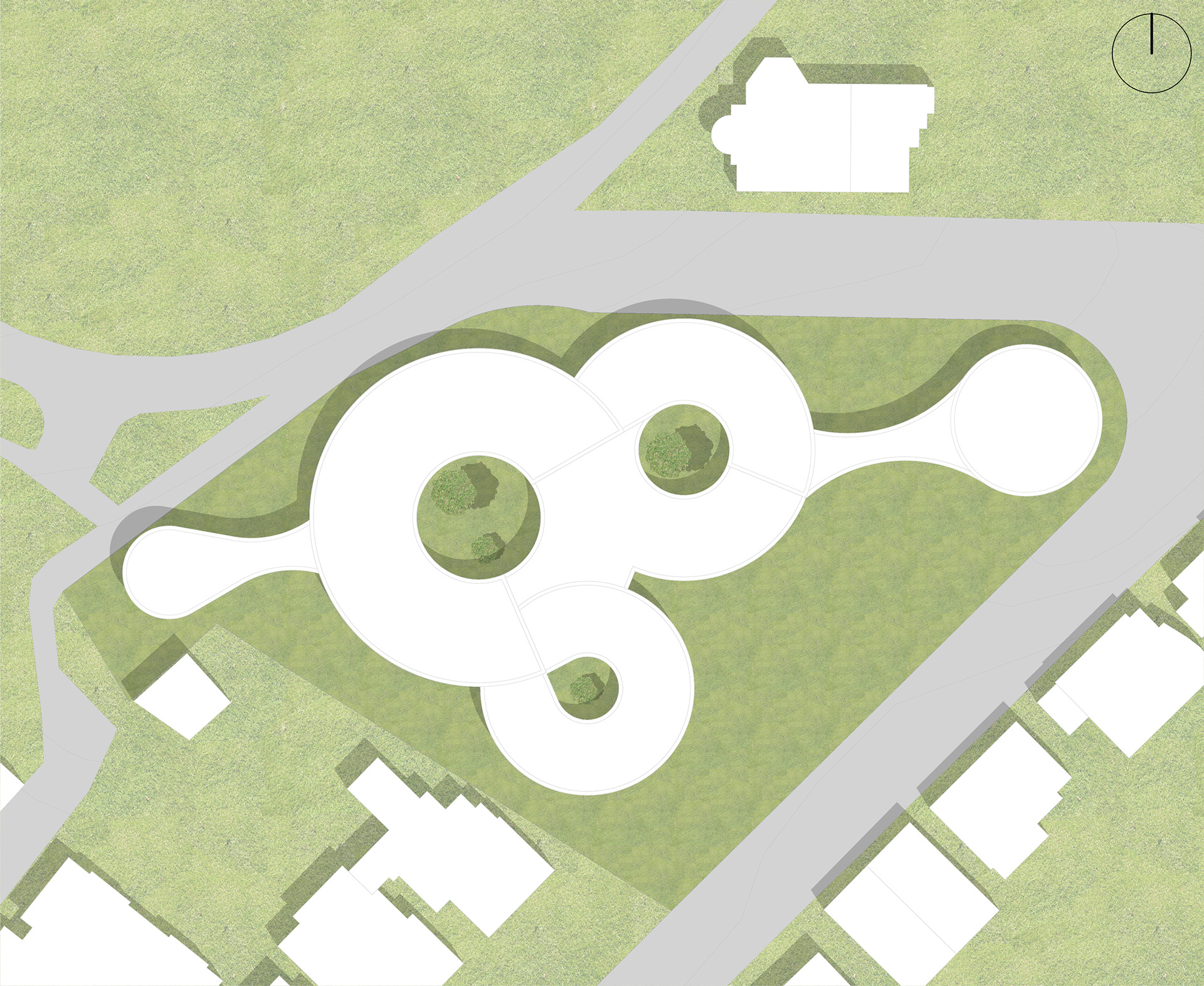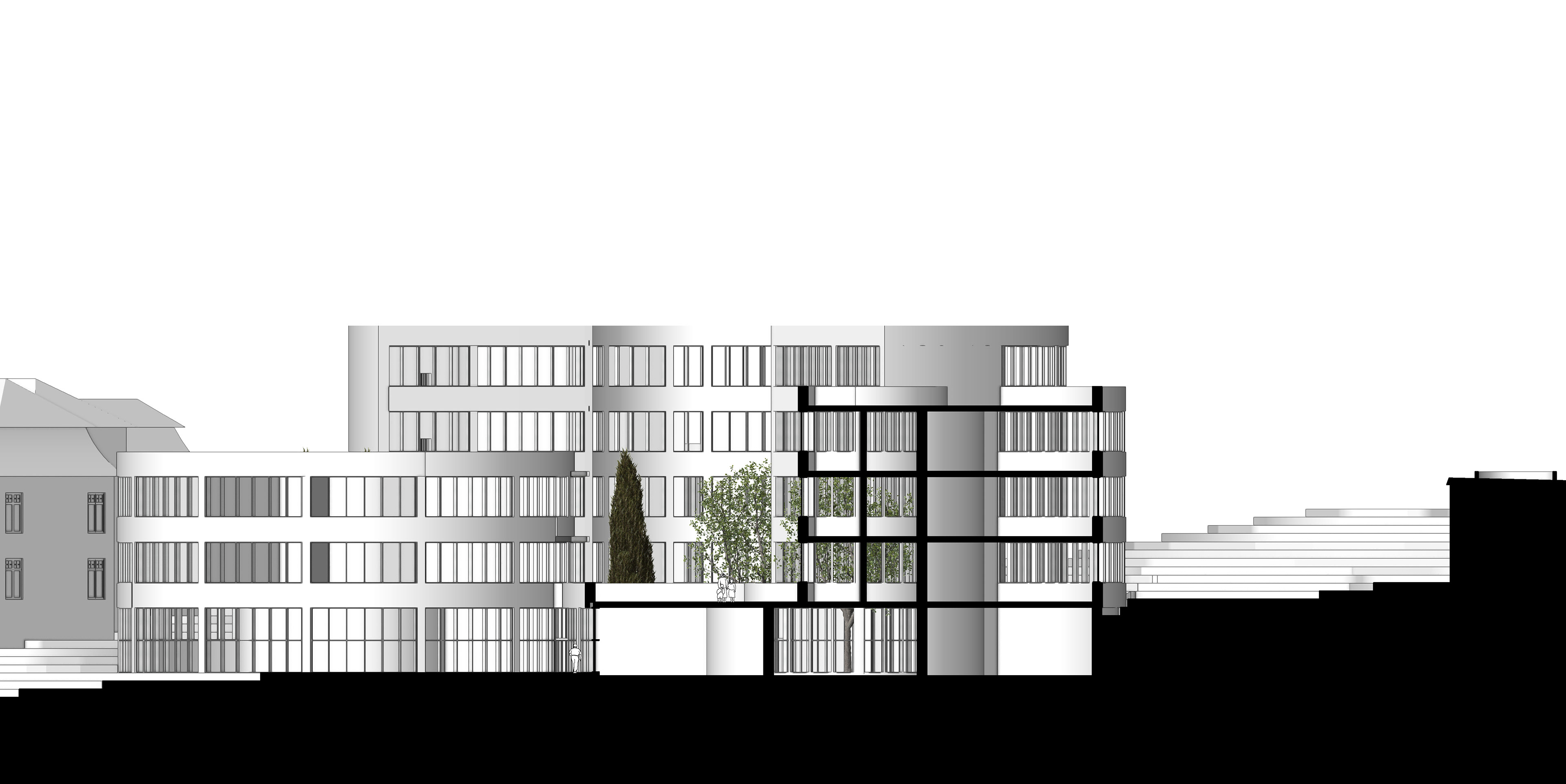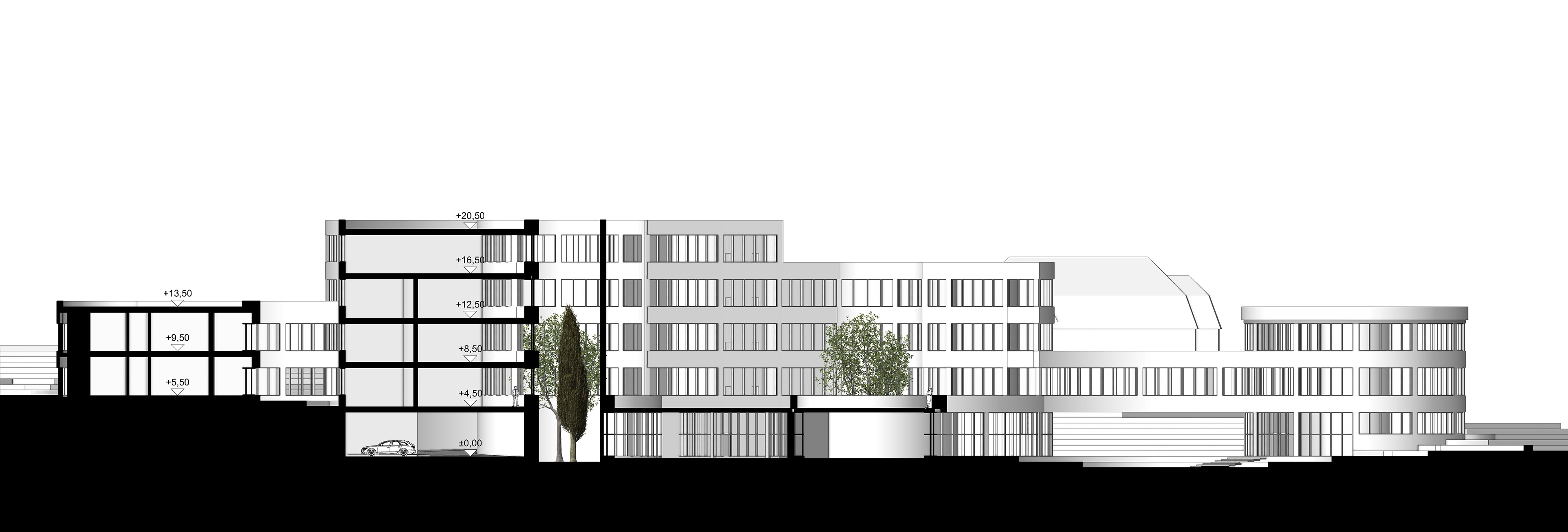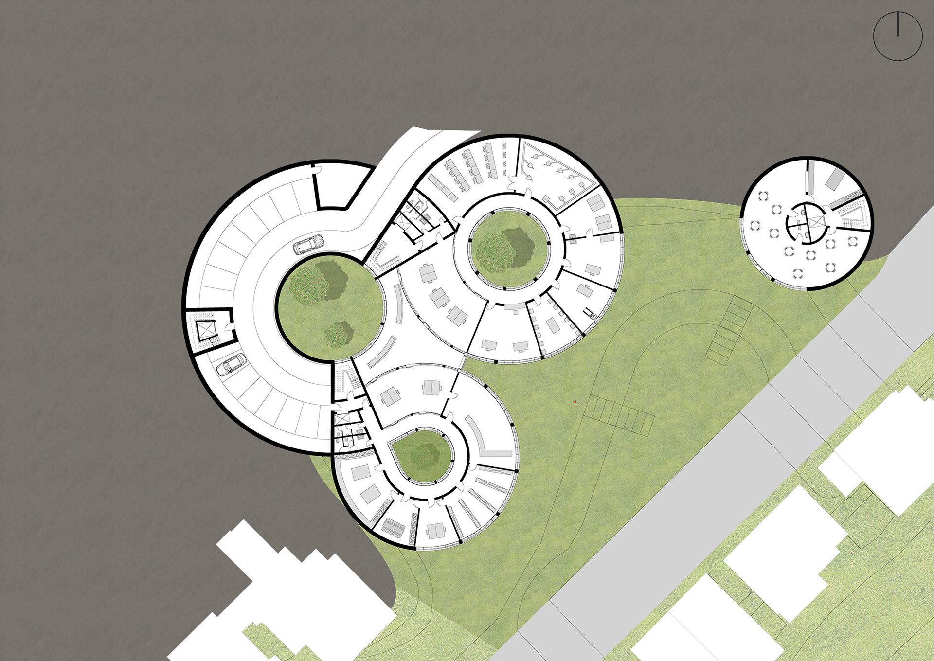 füllt somit das Grundstück weitestgehend aus. Der vordere Gebäudeteil passt sich der Nachbarbebauung an und wird in den Norden hin höher, wie das Grundstück. Der Eingang über die Parkstraße entsteht zwischen den beiden Zylindern des Erdgeschosses. Die drei mittleren Zylinder haben in der Mitte eine grüne Oase, diese bringen Licht in den Innenraum und bieten eine durch die Glasfassade eine Sicht ins Grüne. Das Gebäude wird durch drei Treppenhäuser erschlossen, die sich an den Schnittpunkten, der Kreisbögen befinden.