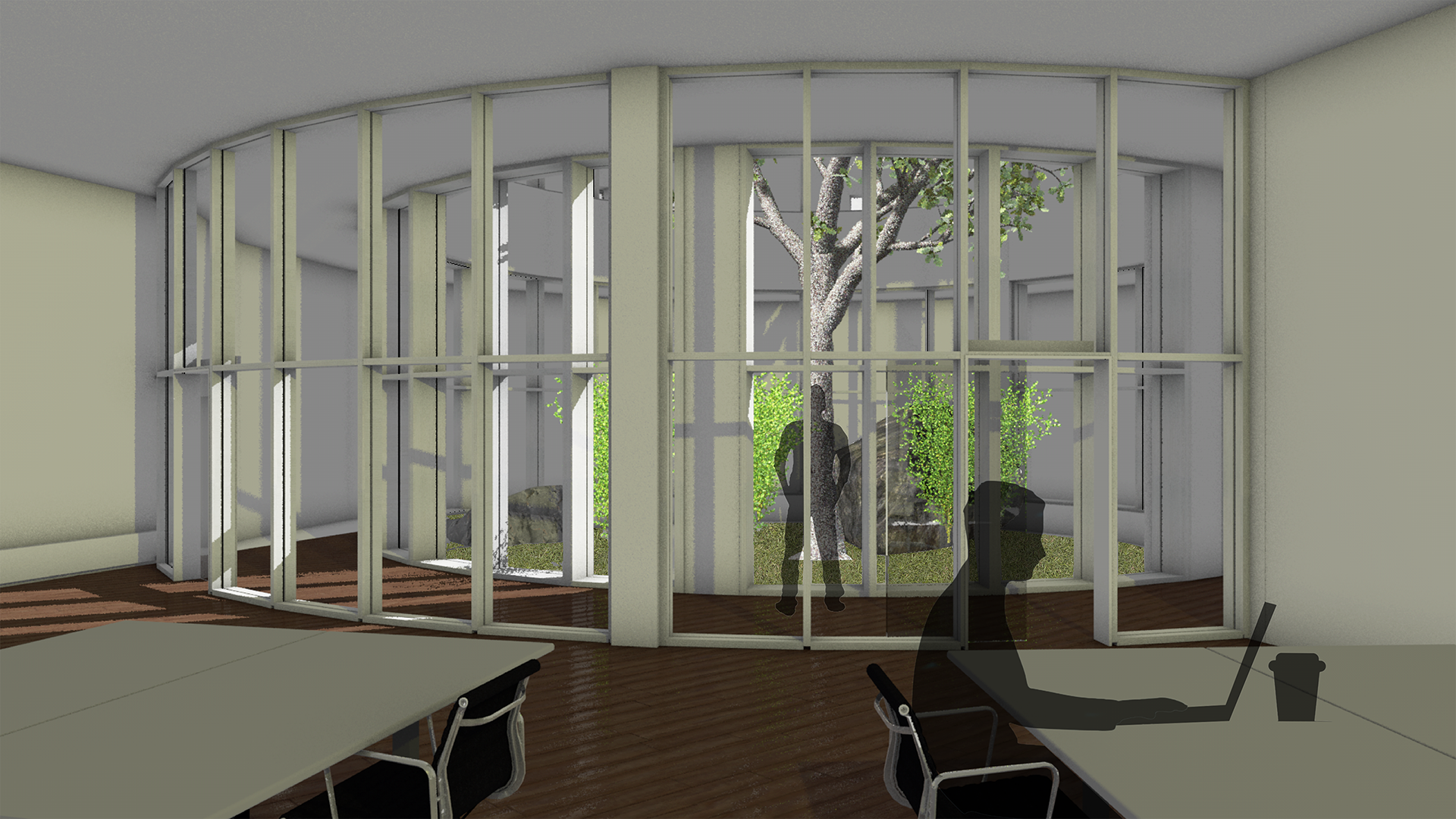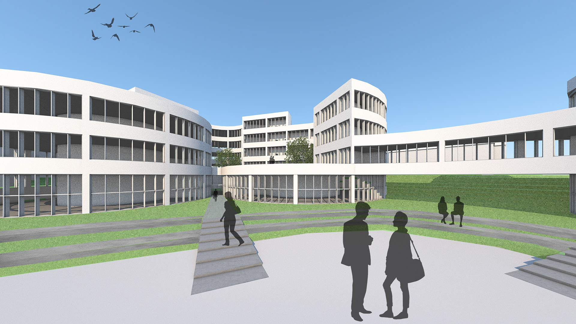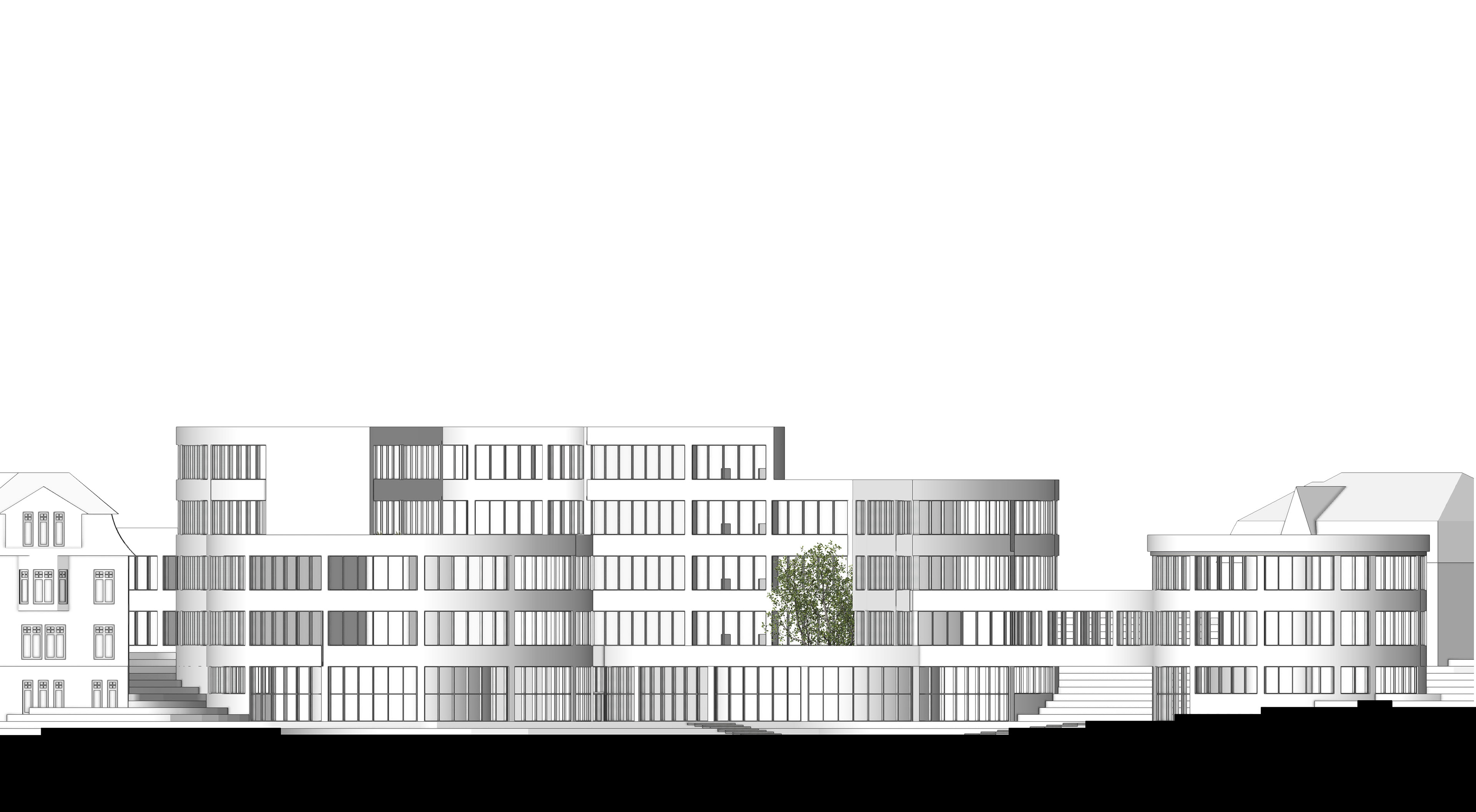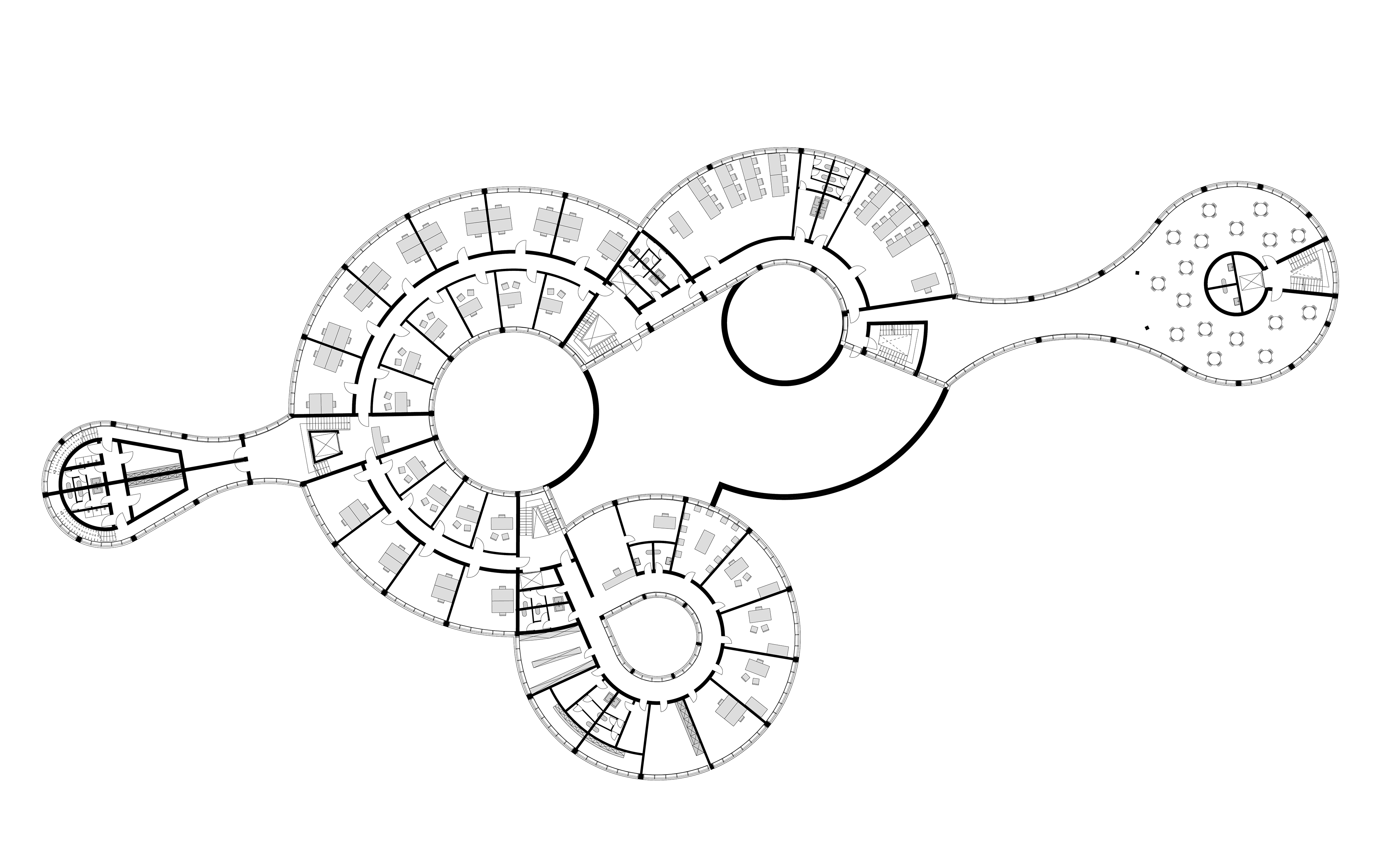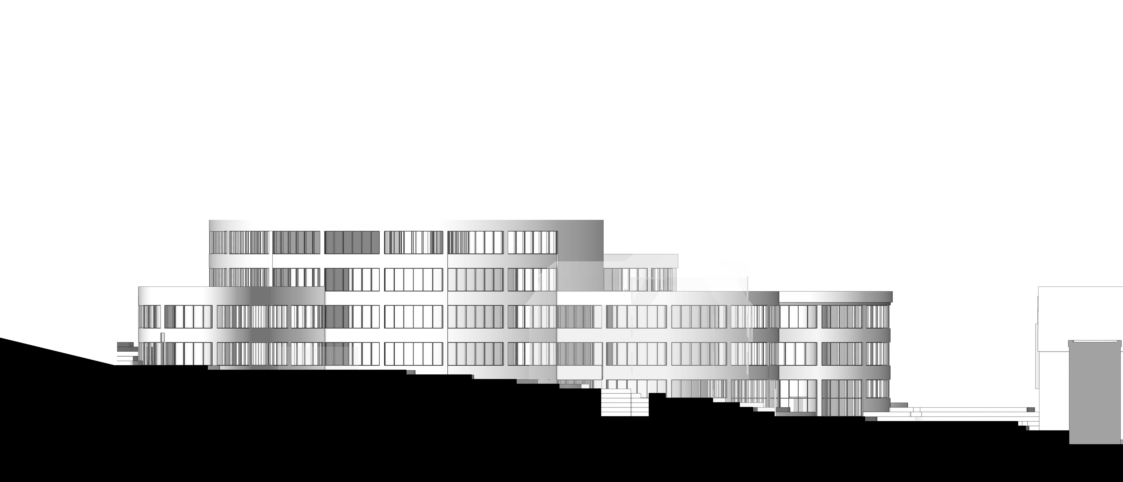 füllt somit das Grundstück weitestgehend aus. Der vordere Gebäudeteil passt sich der Nachbarbebauung an und wird in den Norden hin höher, wie das Grundstück. Der Eingang über die Parkstraße entsteht zwischen den beiden Zylindern des Erdgeschosses. Die drei mittleren Zylinder haben in der Mitte eine grüne Oase, diese bringen Licht in den Innenraum und bieten eine durch die Glasfassade eine Sicht ins Grüne. Das Gebäude wird durch drei Treppenhäuser erschlossen, die sich an den Schnittpunkten, der Kreisbögen befinden.