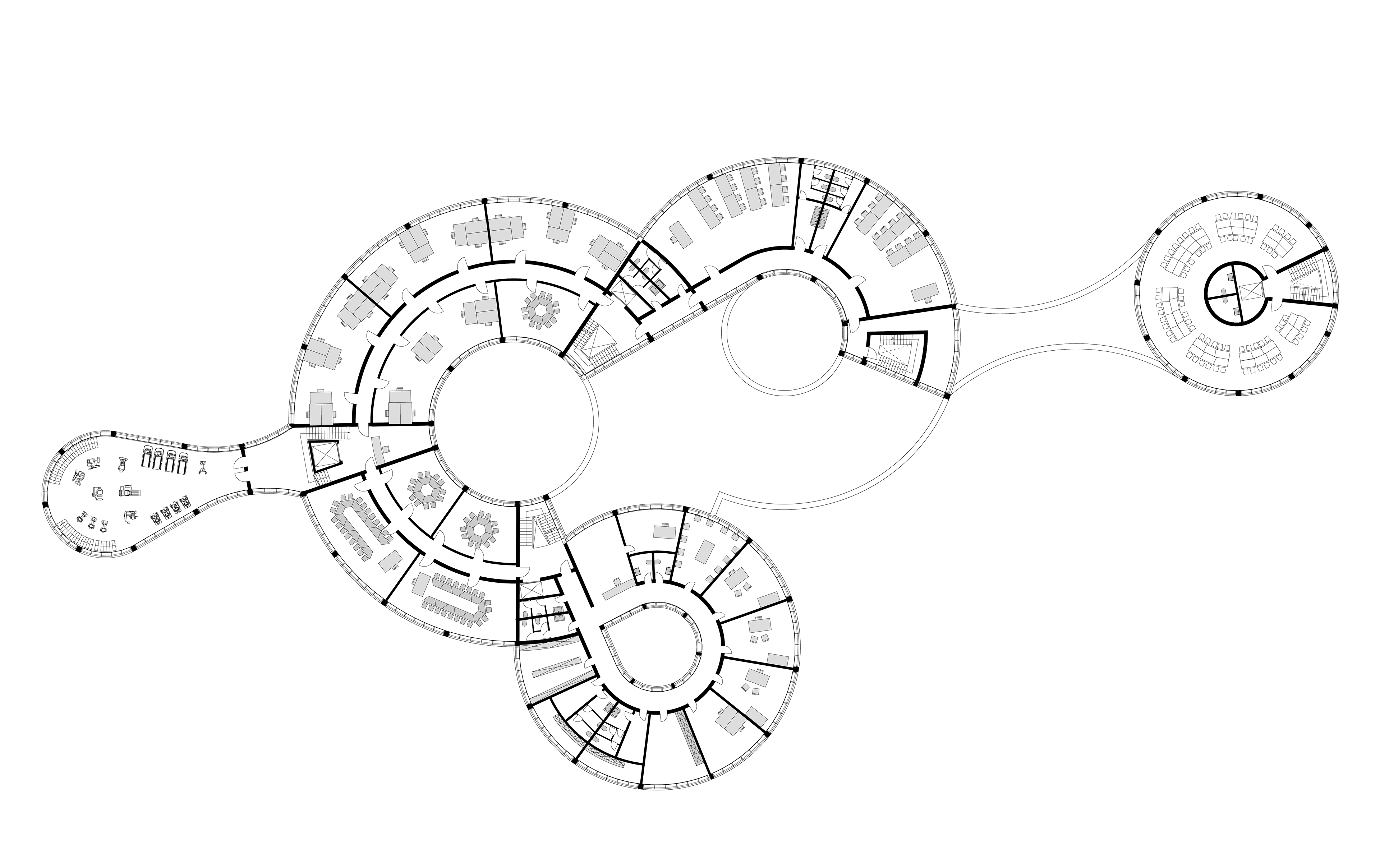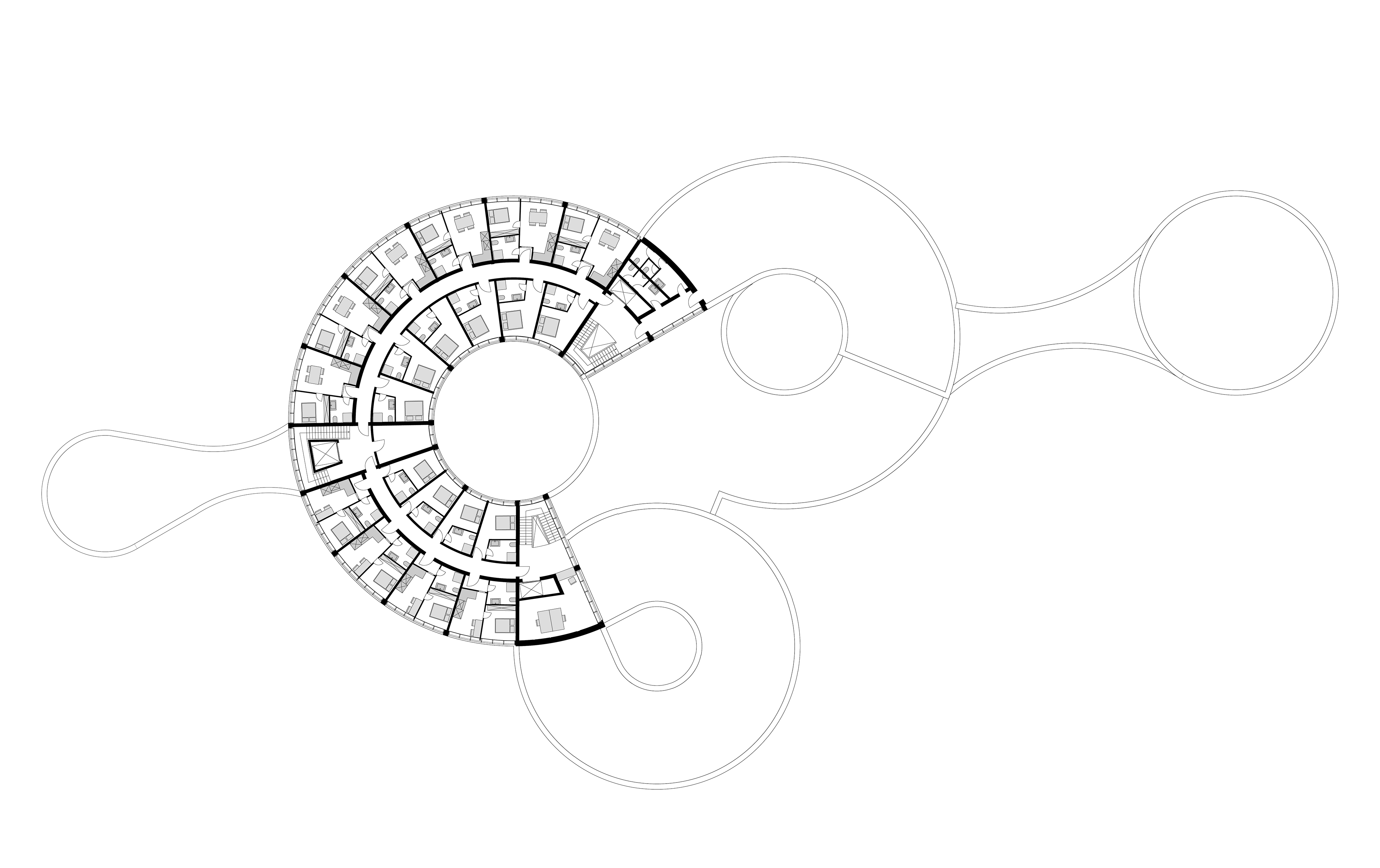 Im südlichen Zylinder des EGs ist eine Apotheke und im nördlichen eine Prothesenwerkstatt. Der große Zylinder ist die Tiefgarage. Im östlichen ist eine Cafeteria. Die oberen Geschosse haben in den südlichen Kreisbögen Arztpraxen und in den nördlichen Schulungsräume. Diese werden im inneren Flur erschlossen. Der große mittlere Kreisbogen hat einen innenliegenden Flur und bietet so genügend Platz für ein Bürokomplex, durch die Skelettbauweise können die Büros somit variabel gesetzt werden. Im obersten Geschoss sind kleine Wohnung oder Zimmer, die von Besuchern gebucht werden können. Im westlichen Kreis befindet sich ein Fitnessraum mit Umkleidekabinen und Duschen.