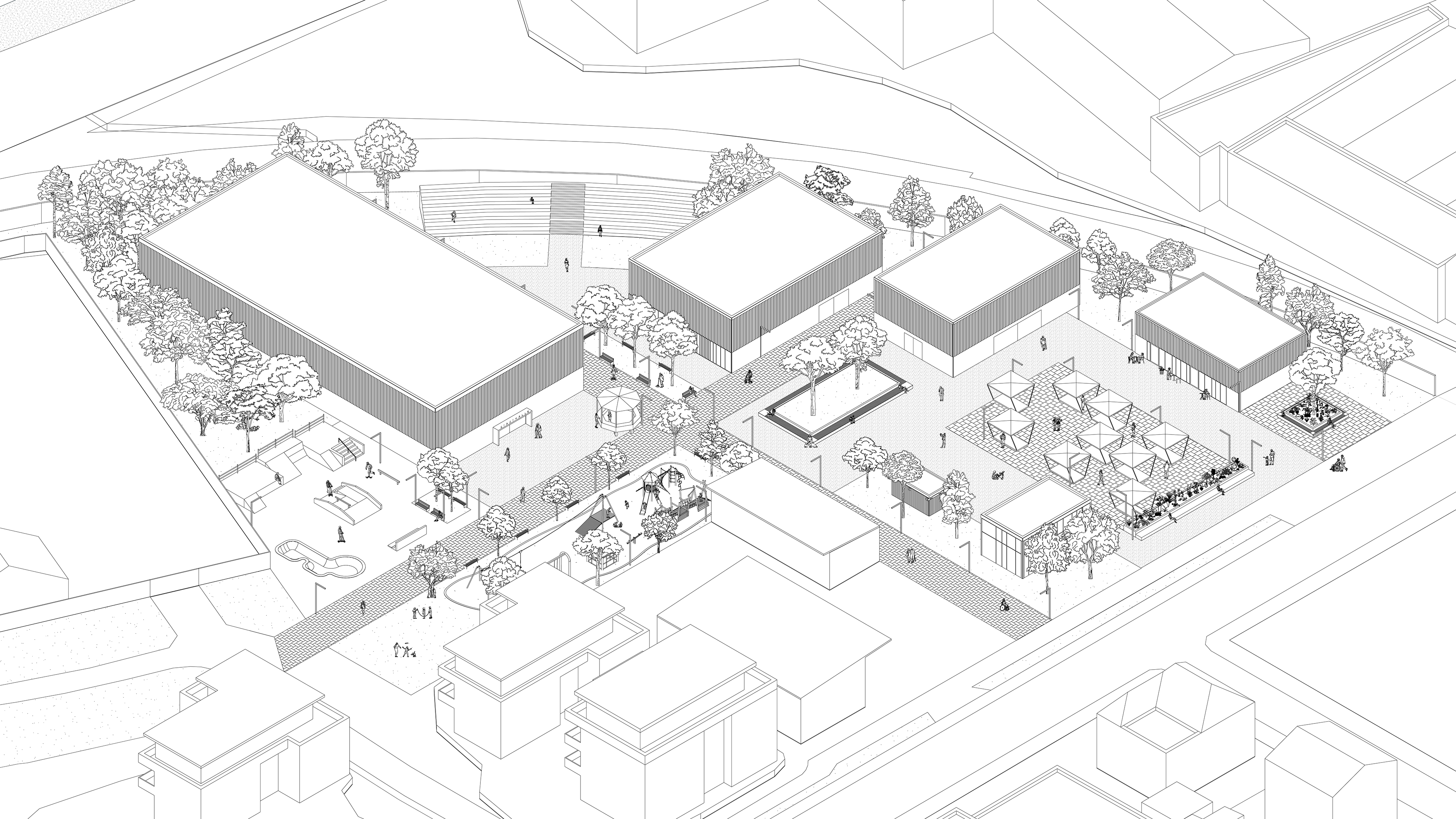 Alle Bauten folgen einem einheitlichen Konzept: eine Holzkonstruktion innen, außen eine Hülle aus transluzentem Polycarbonat, das Tageslicht einlässt und nachts Licht nach außen abgibt. Sechs Gebäude bieten vielfältige Funktionen: eine Stadthalle für Veranstaltungen, ein Co-Working-Gebäude nach dem „Haus-in-Haus“-Prinzip, eine Werkstatt, ein Café, ein Atelier und eine öffentliche Toilette. Die Freiflächen sind in vier Bereiche unterteilt: einen Spielplatz als Ersatz für den alten, einen Skatepark, eine Freilichtbühne mit Tribüne und einen Marktplatz. Darüber hinaus bieten zahlreiche Sitzmöglichkeiten den Besuchern des Areals Aufenthaltsqualität und laden zum Verweilen ein.